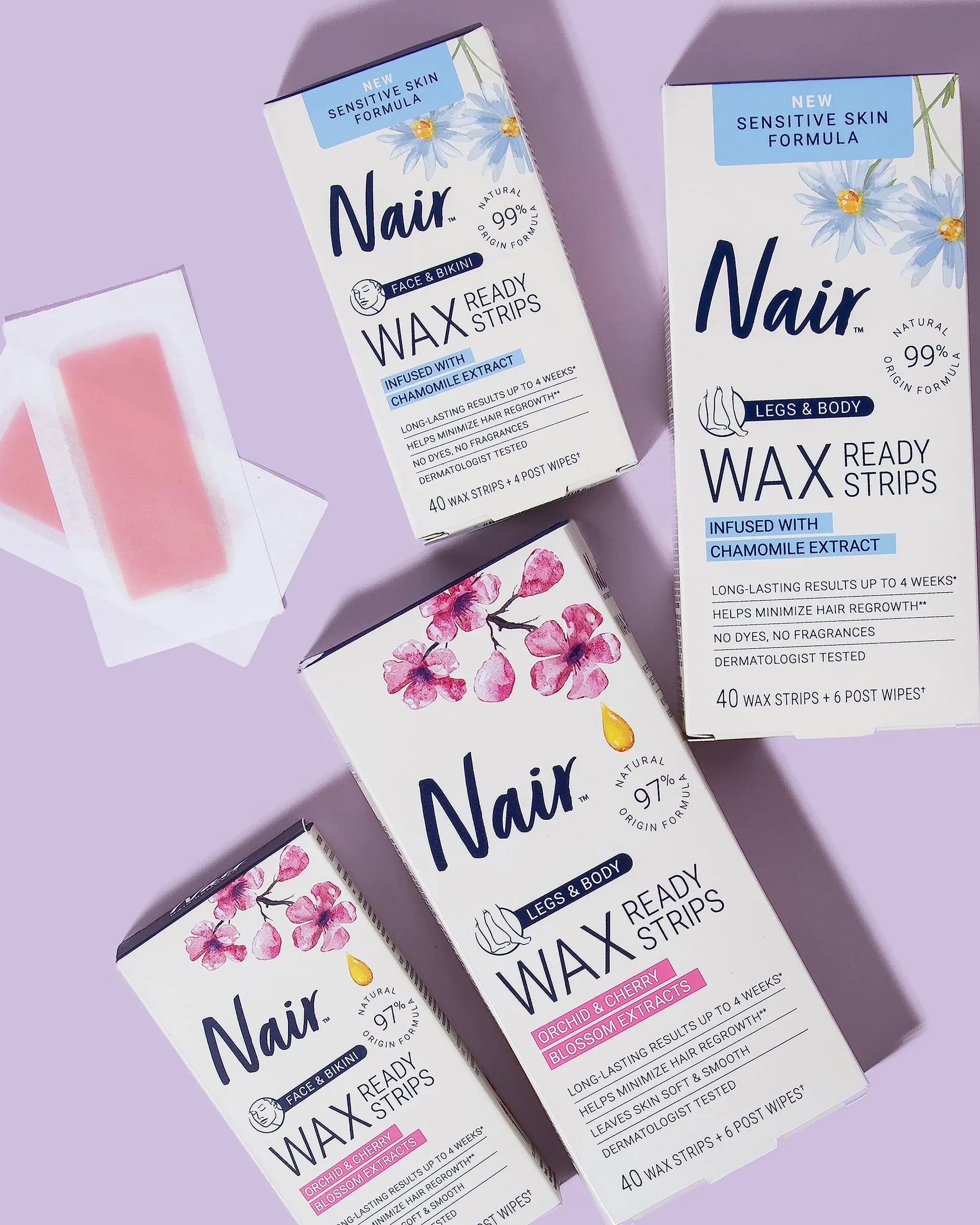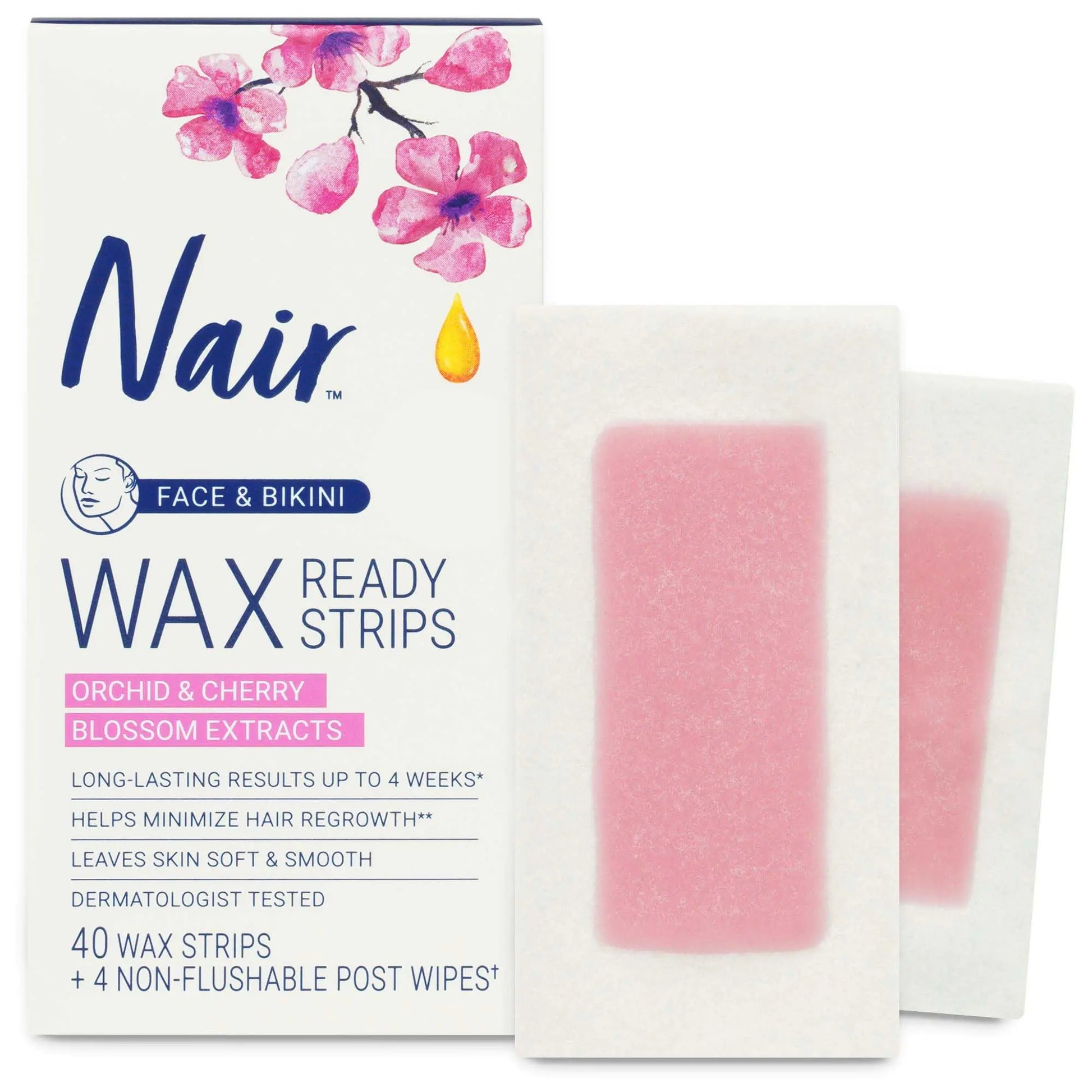 Nair Hair Remover Wax Ready Strips are the easy, no mess, no warming DIY way to wax at home so you can be your own salon. This dermatologist-tested facial hair remover for women helps remove stubborn hairs and reveal beautiful, hair- free skin on your oh-so-sensitive areas. These DIY face and bikini hair removal wax strips give you smooth results that last for up to four weeks and help minimize hair regrowth with repeated use. Safe for all skin types, this facial hair remover can be used on the face and bikini area. Nair hair remover wax strips are ready to use right out of the box. Just peel and place strips in the direction of hair growth—no warming or rubbing required. Press the wax strip down firmly and smoothly. Hold skin taut and quickly remove strip in the opposite direction of hair growth. Use the included post wipes to soothe and moisturize the skin and remove any wax residue. It’s that easy! Trusted since its introduction in 1940, Nair has always been a leader in hair removal. Nair offers a full range of high-quality, easy-to-use hair remover products. In addition to body and facial hair removal for women, Nair offers an entire line of depilatory products designed specifically for men. Reveal a smooth, radiant ew you with Nair! Perfect for: Face and bikini area. All skin types. Fine to coarse hair. FAST AND EASY When we say ready, we mean ready. Wax Ready-Strips can be used right out of the box. No warming, no rubbing, no mess, no worries. LONG-LASTING RESULTS Go for wayyy longer than shaving. Waxing helps you stay smooth for up to 4 weeks and even helps minimize hair regrowth with repeated use. DERMATOLOGIST TESTED Trust the experts. Not only has Nair™ been the go-to hair removal brand for over 80 years, we also pass all our products by skincare professionals.